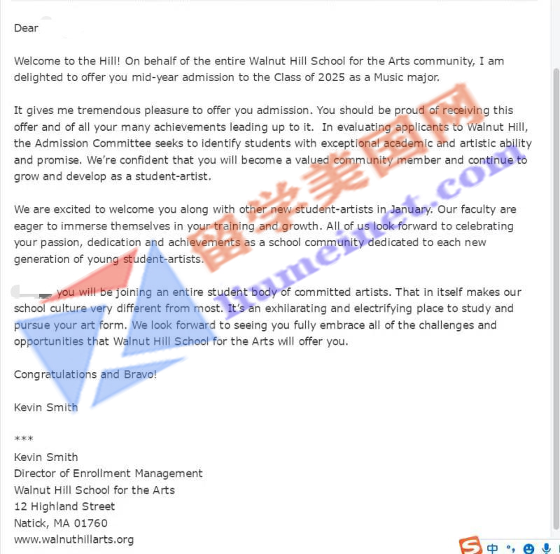 留美网再传录取捷报!恭喜留美网H同学录取到胡桃山艺术高中Walnut Hill School for the Arts~