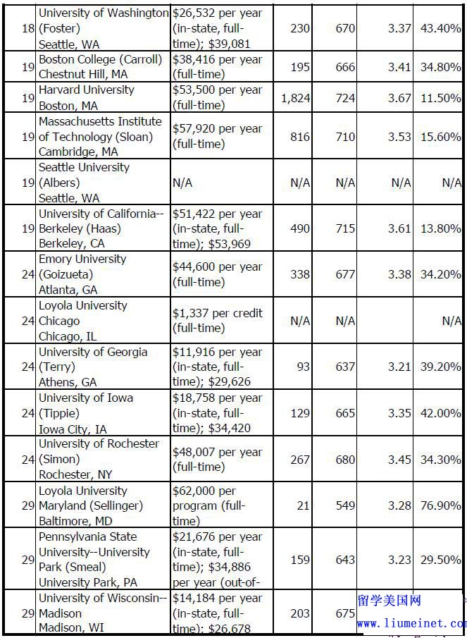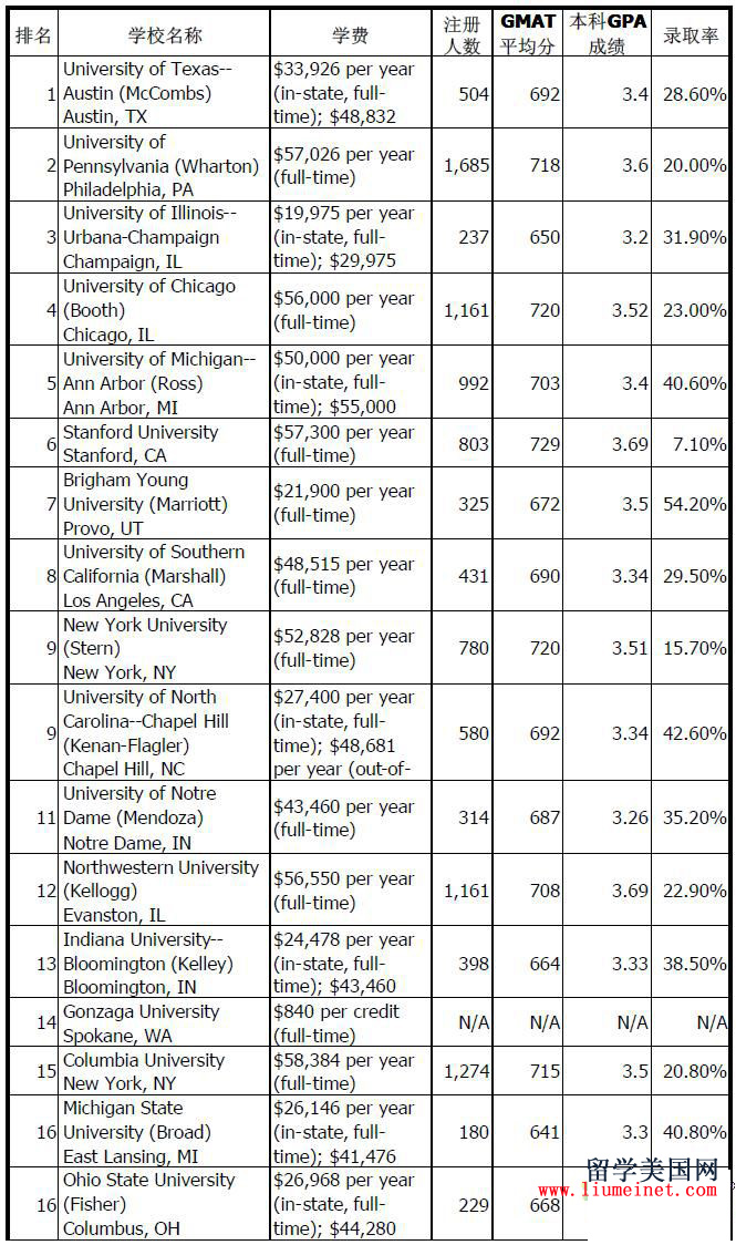 美国会计专业TOP30院校学费+GMAT要求