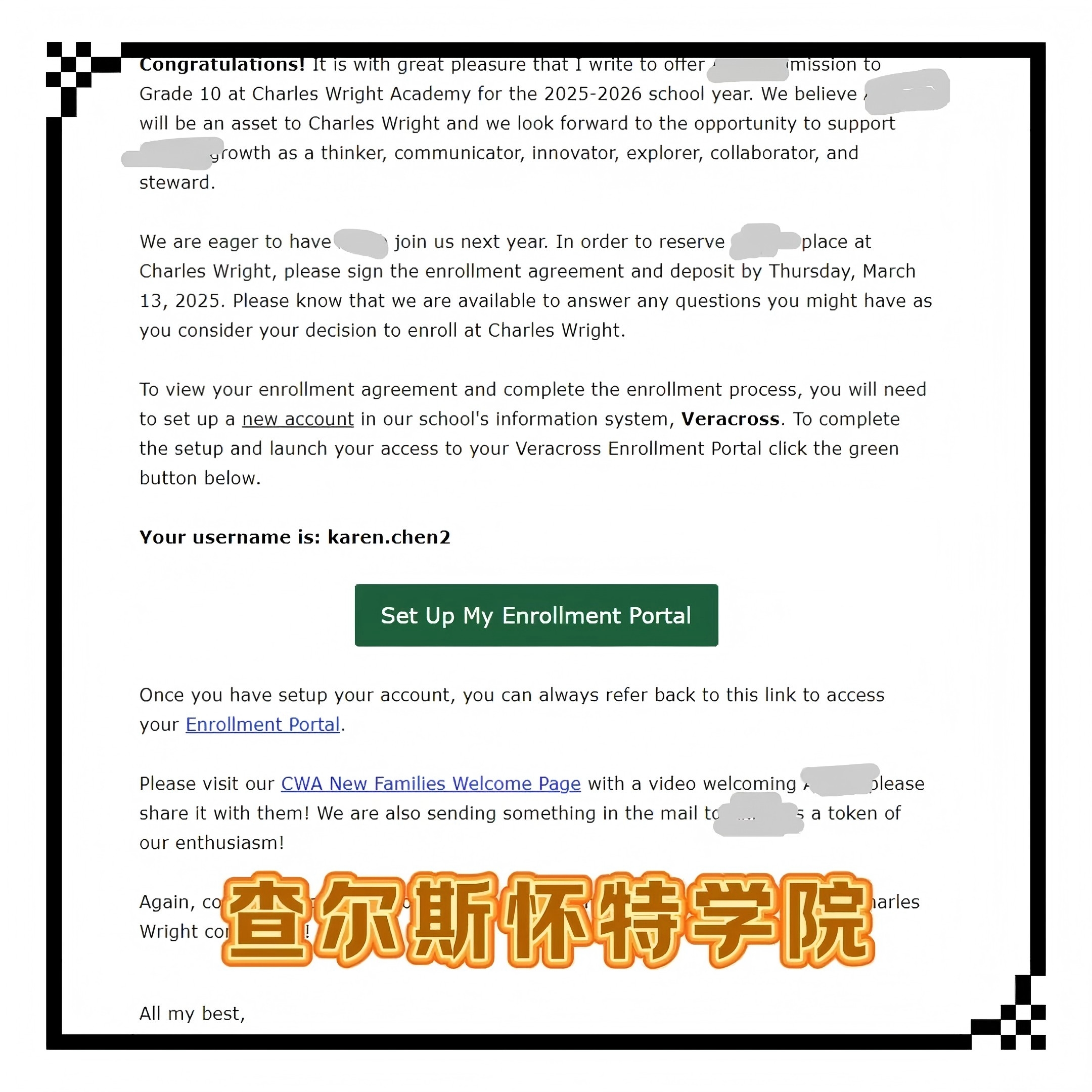 恭喜留美网Y同学收获查尔斯怀特中学录取offer!