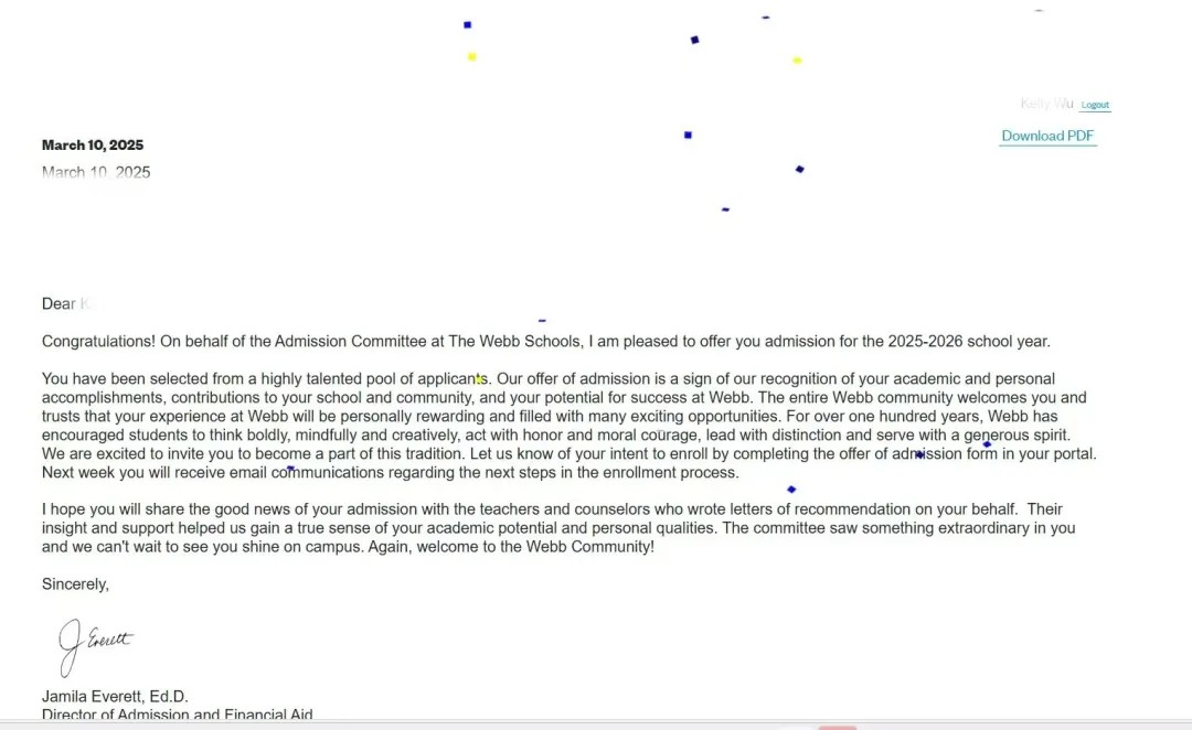 恭喜W同学收获录取,愿她怀揣着对未来的憧憬,踏上美国私立高中的求学之旅。在那里,她将会获得自我规划能力、自我约束和自我激励的能力,充分利用丰富的课程、多样的体育项目、活跃的社团活动和有意义的社区服务机会,实现学业上的突破,收获社交和个人方面的成长。