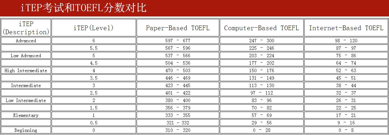 iTEP slate 成绩与托福成绩对比表!