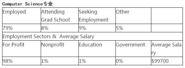 从上面表格可以出,单独在加州大学伯克利分校内两个计算机专业分支内,cs专业的就业人数较多,继续进修的人数较少,而EECS专业上虽然就业人数较CS比例少,但有更高的读研进修比例。两个专业分支平均工资均不菲,EECS较高约为年薪人民币68万。这也和加州伯克利位于旧金山湾区,距离硅谷等计算机行业繁荣地区市场需求强劲有关。